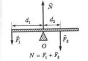 Важіль перебуває в рівновазі, коли діючі на нього сили (F1, F2) обернено пропорційні плечам сил (d1,d2)