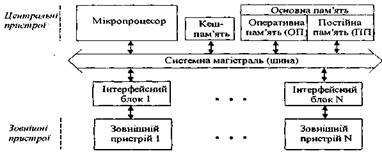 Під структурною організацією комп'ютерів розуміють їх деяку фізичну модель, яка відображає склад, порядок і принципи взаємодії основних функціональних модулів без деталей їх технічної реалізації. Проаналізуємо будову персонального комп'ютера (ПК) на логічному рівні. У структурі ПК виділяють центральні та зовнішні пристрої. До центральних пристроїв відносять мікропроцесор та основну пам'ять, яку ще називають внутрішньою. Зовнішні пристрої часто називають периферійними.