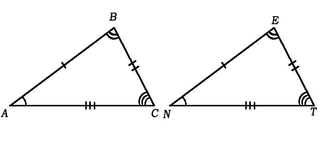 Нехай на рисунку дано два рівні трикутники. Цю рівність коротко можна записати ΔABC = ΔNET