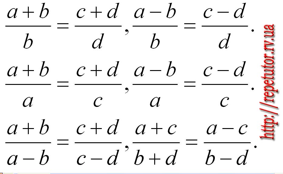 Наведені пропорції свідчать про те, що у будь-якій пропорції можна переставляти: середні члени; крайні члени; середні і крайні; крайні на місце середніх і середні на місце крайніх. Похідні пропорції: