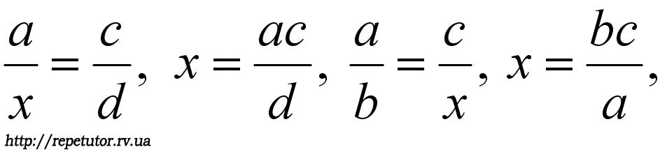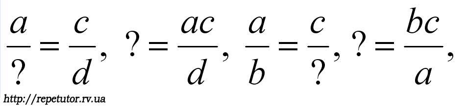 Знаходження невідомих членів пропорції. Щоб знайти невідомий середній (крайній) член пропорції, треба добуток крайніх (середніх) членів розділити на відомий середній (крайній) член даної пропорції.